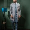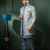 Cherish your heritage with our exceptional blue jacquard Indo-Western sherwani set. This contemporary ensemble showcases a wealth of design and traditional craftsmanship. The delicate patterns and the textural elements give a regal minimalist vibe. Perfect for those who seek sophisticated ethnic wear for an elegant occasion.