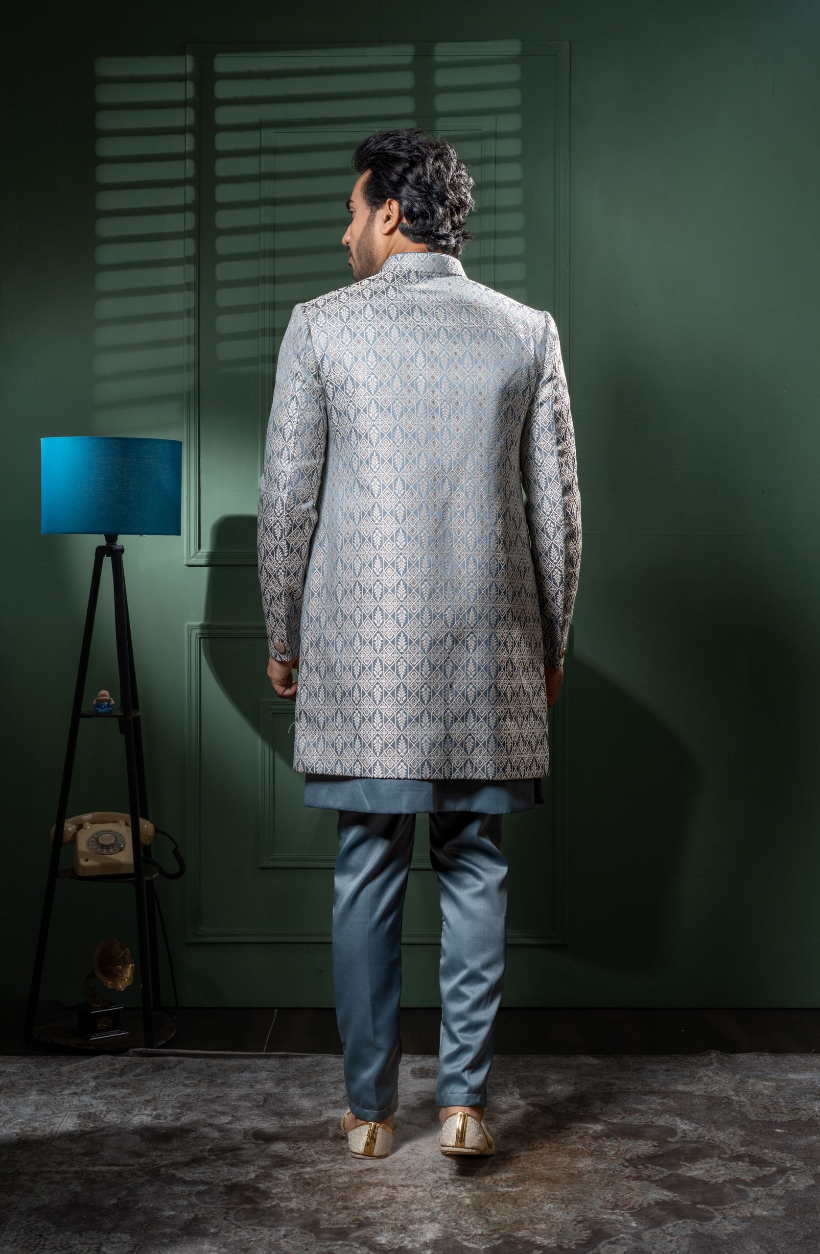 Men’s Blue Jacquard Indo-Western Sherwani Set – Premium Wedding & Reception Wear “Tradition wrapped in lavender luxury.”