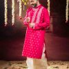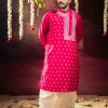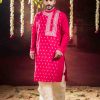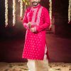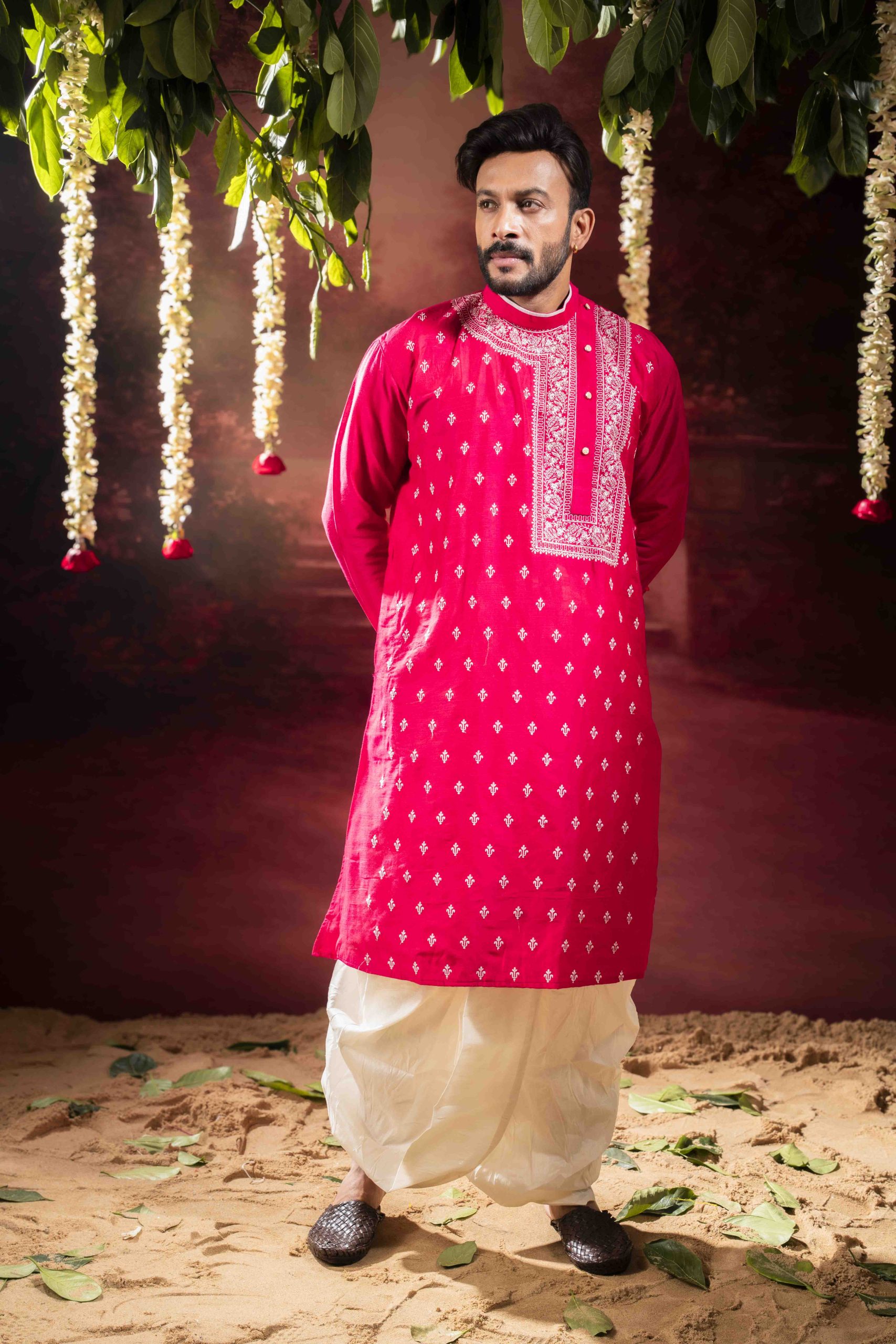 The distinctive side-neck design adds a contemporary touch to a classic silhouette, making it a perfect choice for weddings, festive occasions, cultural events, and traditional ceremonies. Paired with a matching dhuti pant, this ensemble delivers a polished and graceful look ideal for modern men who appreciate heritage fashion.