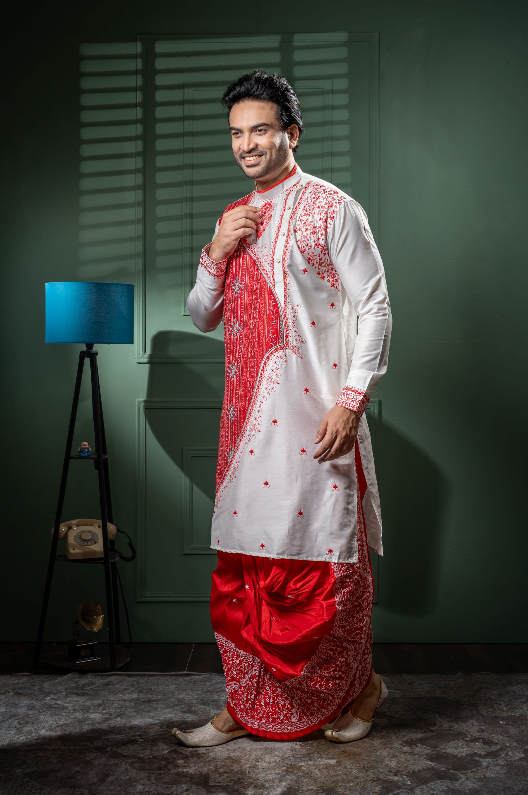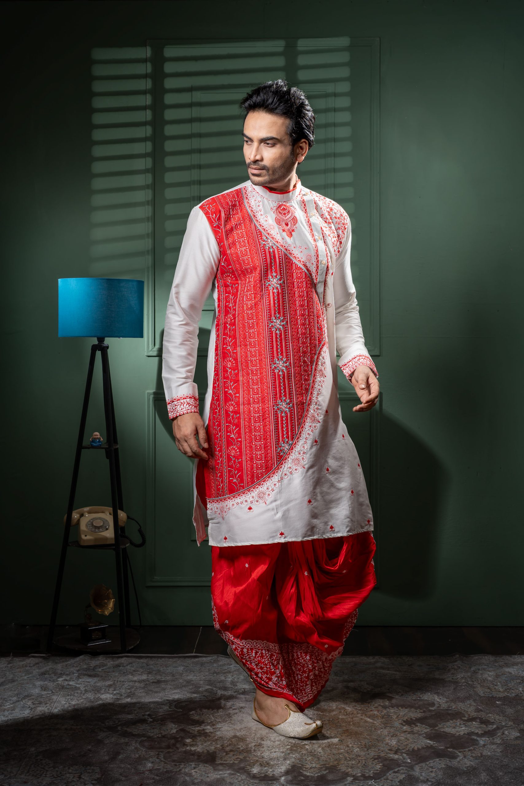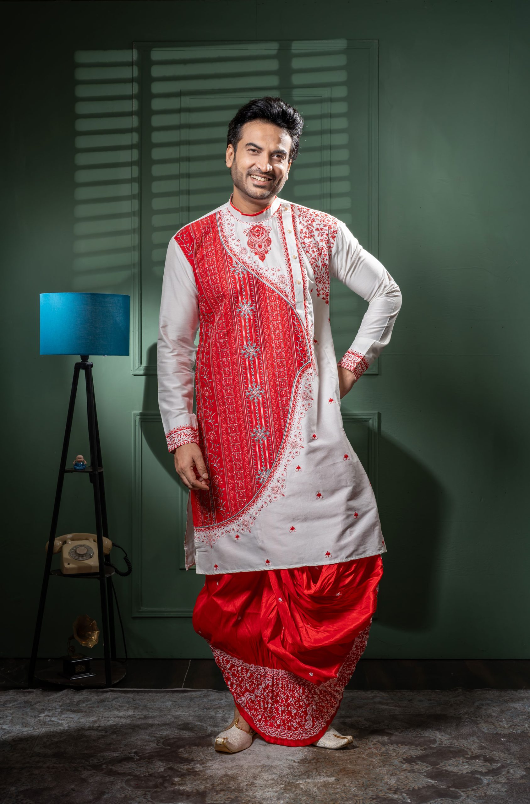 Step into warm nostalgia with this Designer Embroidered Kurta Dhoti Set. The immaculate design draws inspiration from traditionality. Experience weddings and celebrations with this exquisite piece of art.