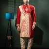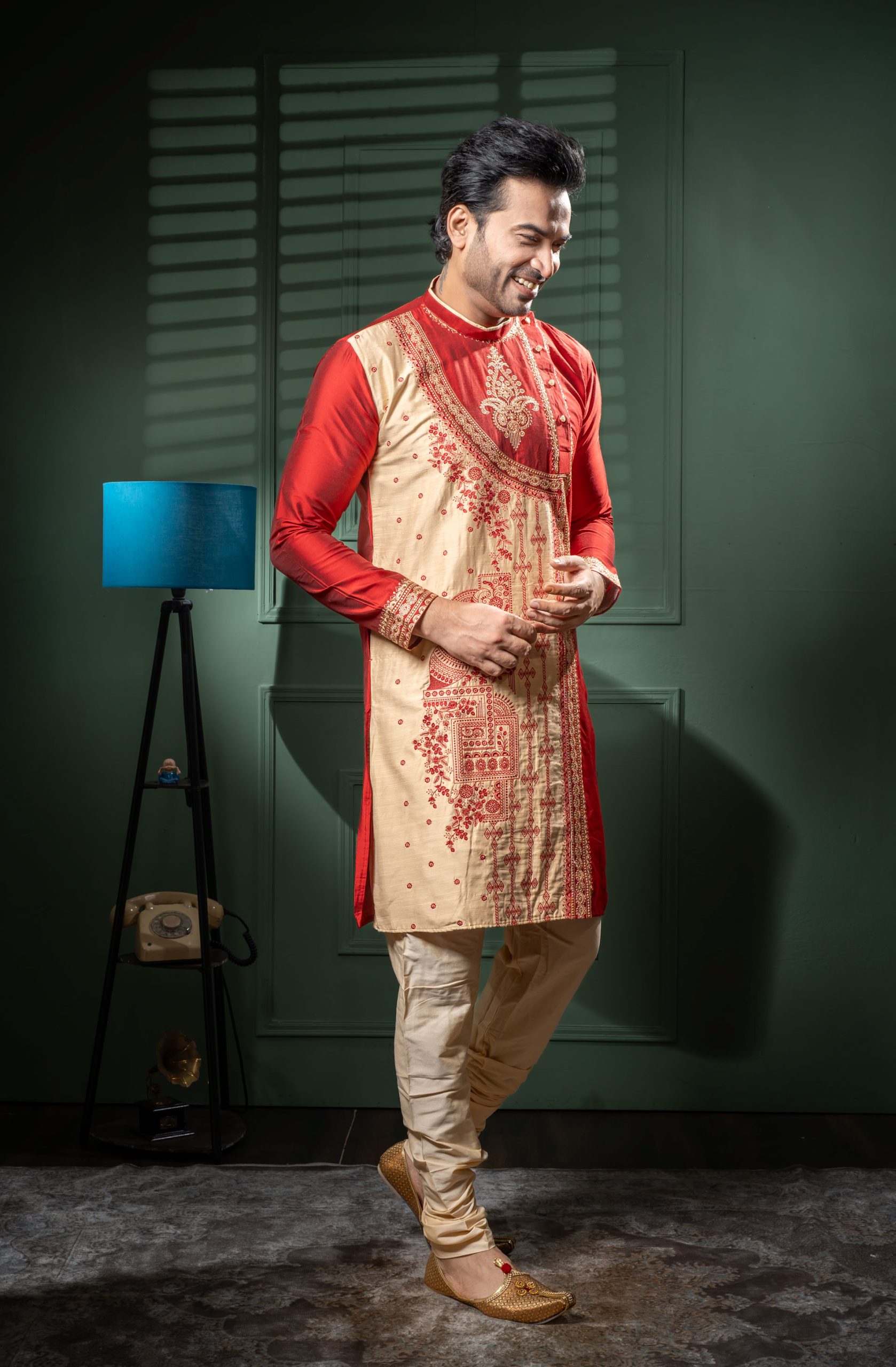 Grab attention with this stunning maroon masterpiece that whispers tales of royal heritage. Our designer raw silk embroidered kurta with pajama transforms every occasion into memorable times. The intricate embroidery is carefully threaded across the fabric to evoke a sense of regal elegance. Perfect for weddings, festivals, and cultural gatherings.