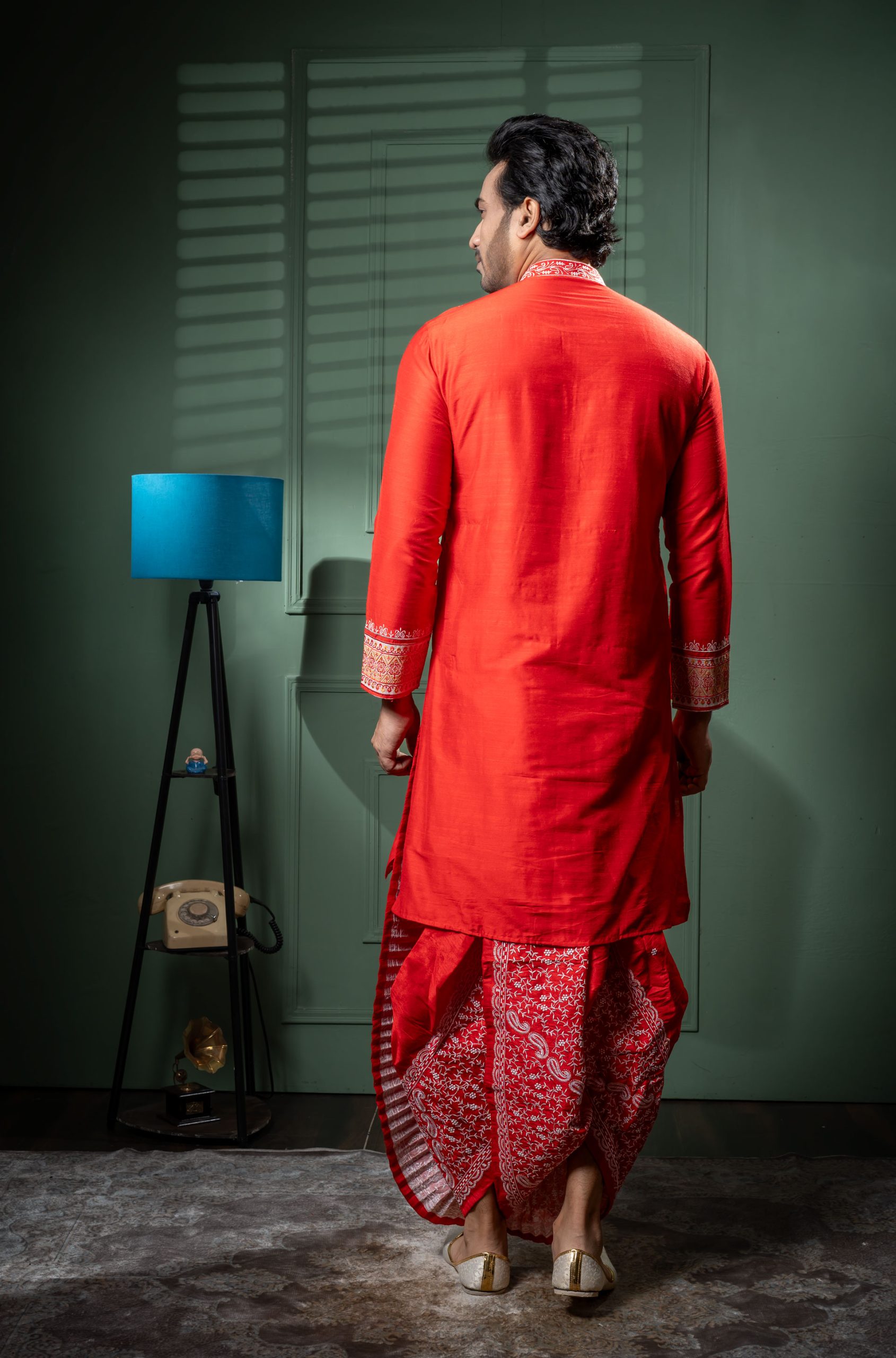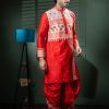 Embrace timeless elegance with this striking red kurta and dhoti combo with an equally stunning white embroidery. The graceful combination of the red kurta and the intricate white designs across the ensemble reveals a luxurious look. The richness of the garment and the traditional Indian craftsmanship give it a refined simplicity.