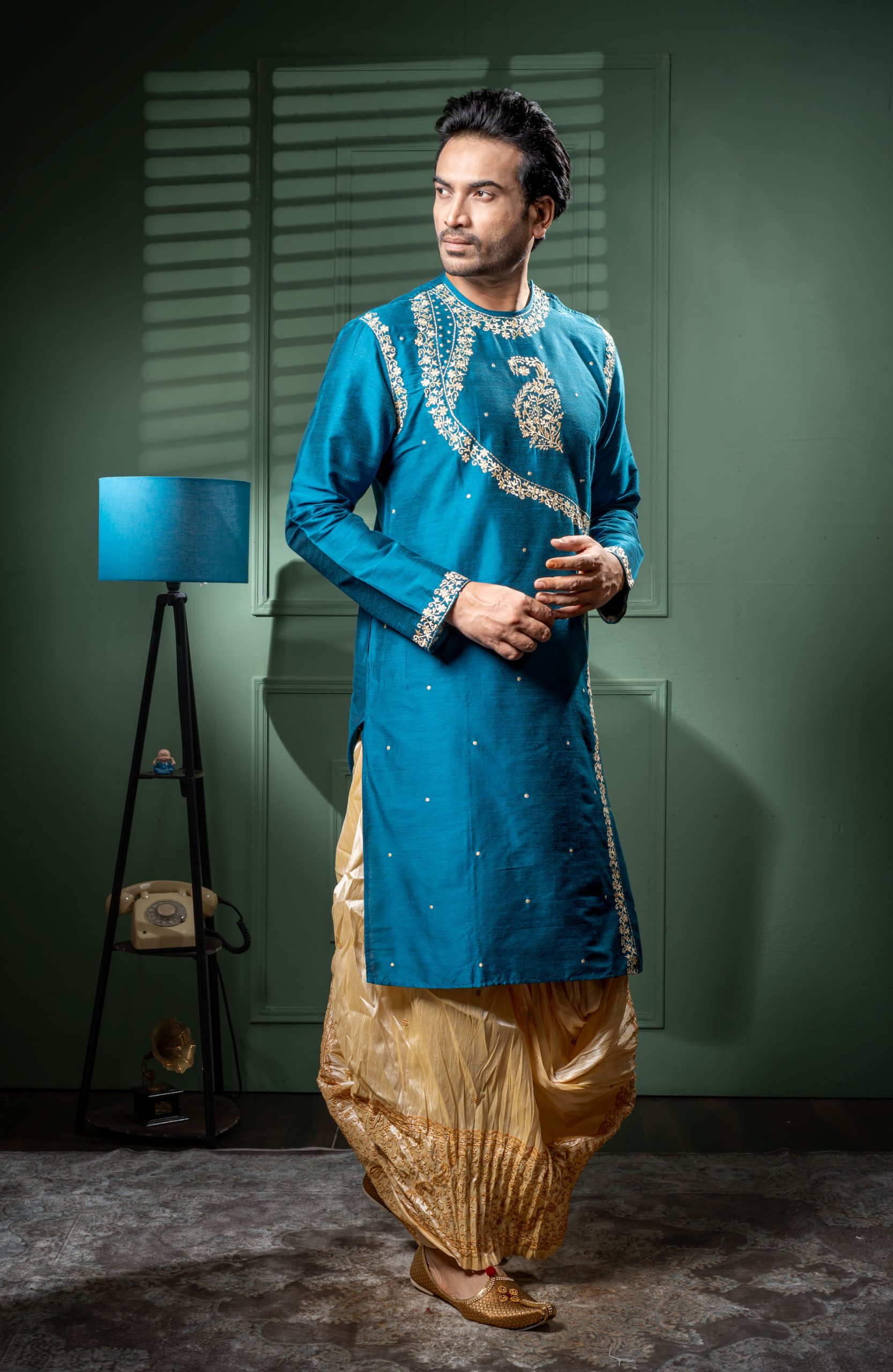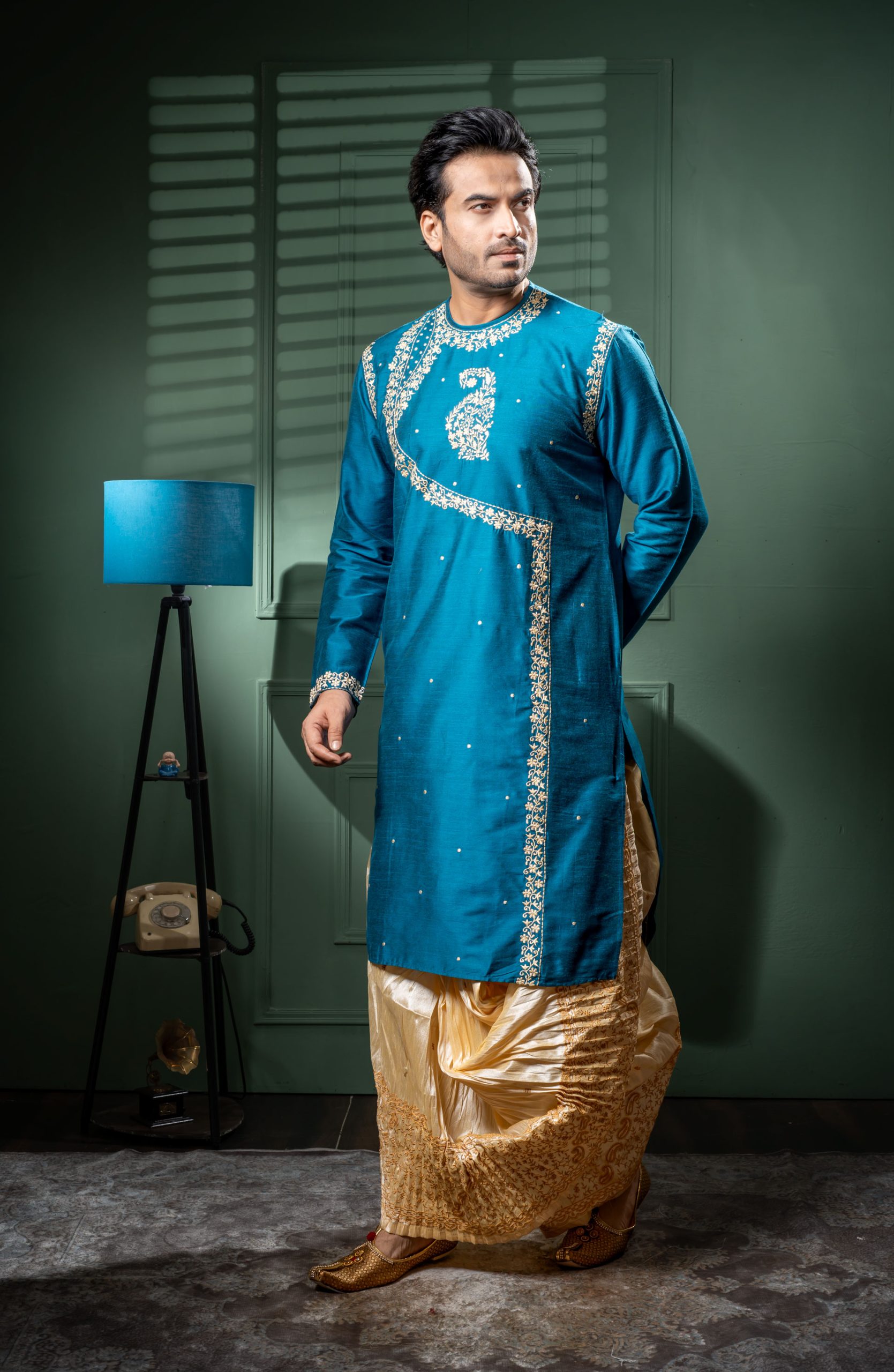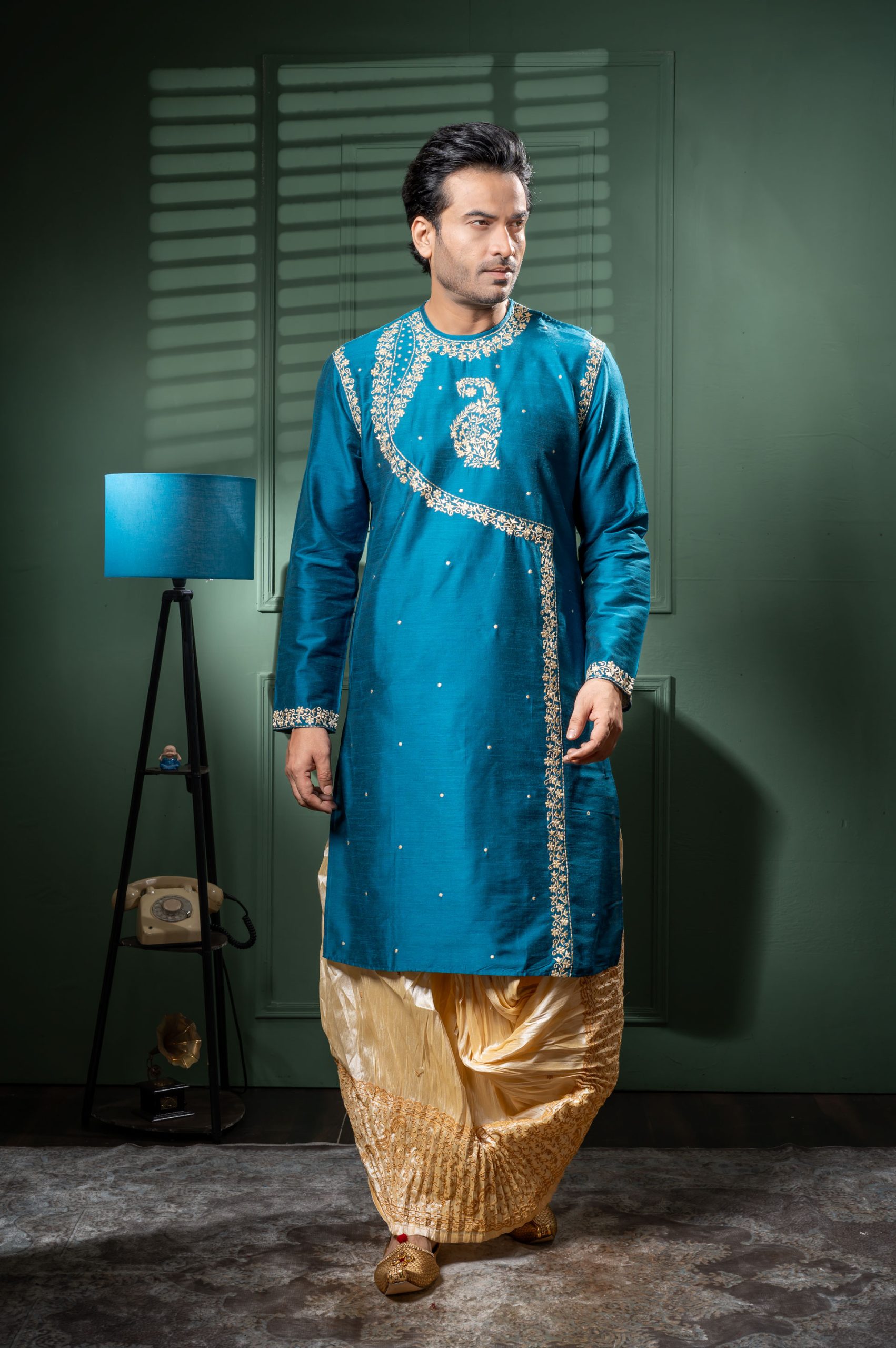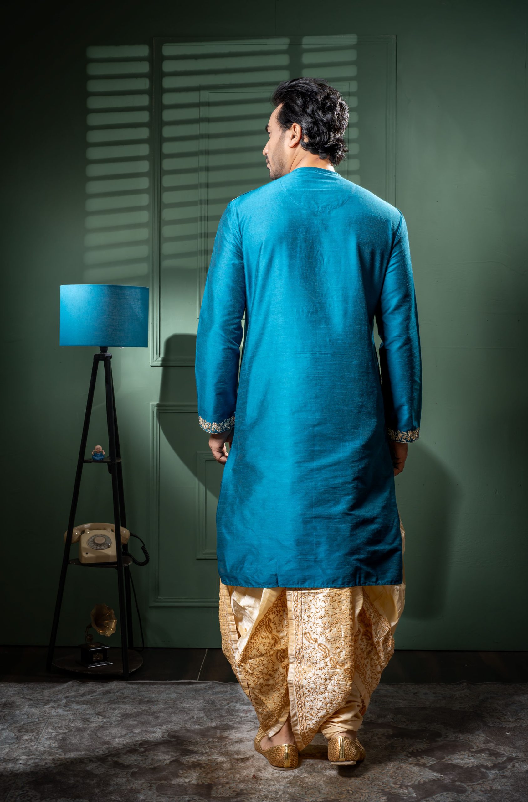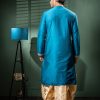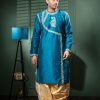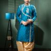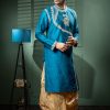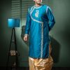 Bask in the celestial glow of this raw silk round neck kurta with dhoti set. This exquisite handwork kurta is a testament to India’s unparalleled craftsmanship, where every stitch is placed with skilled precision. The classic round neck design adds timeless appeal while the flowing dhoti enhances your natural charisma.