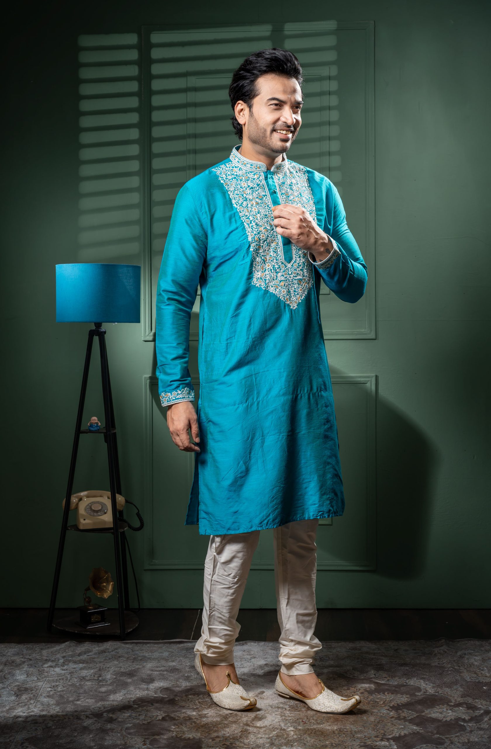 Embrace timeless tradition with our embroidered raw silk kurta pajama set. The serene firoza blue tone, enriched with intricate white embroidery, showcases cultural finesse. This ensemble is meant for those who value artistry woven into tradition. The raw silk texture gives the traditional wear a distinguished character, ideal for any festive occasion.