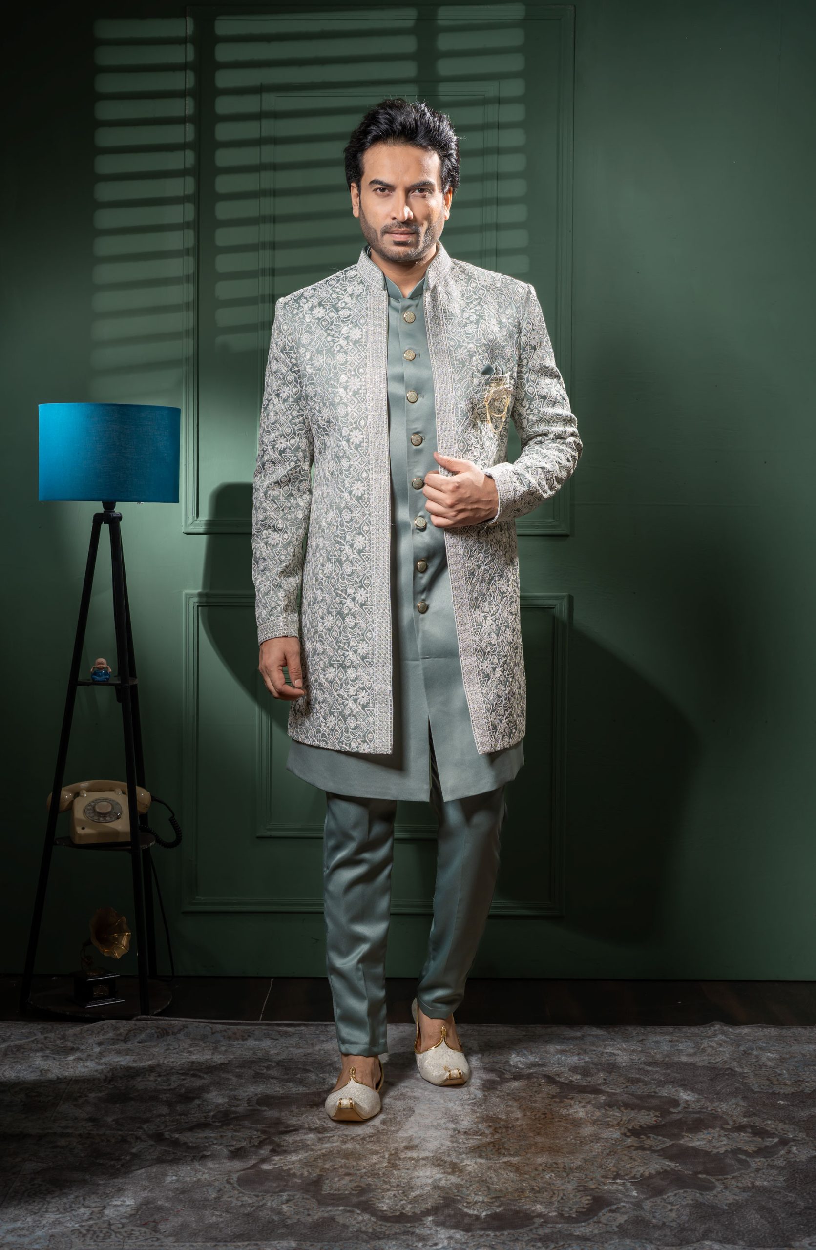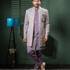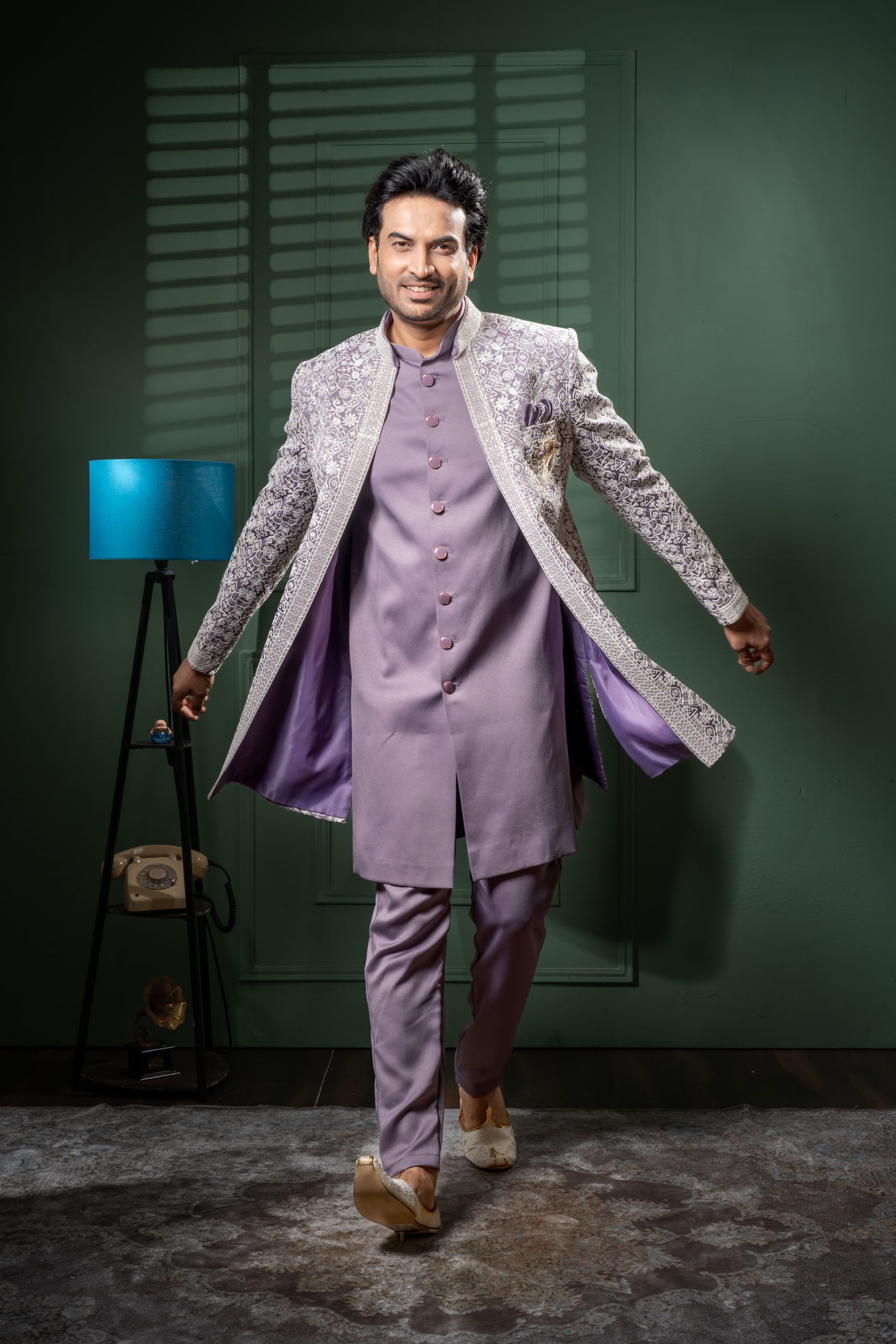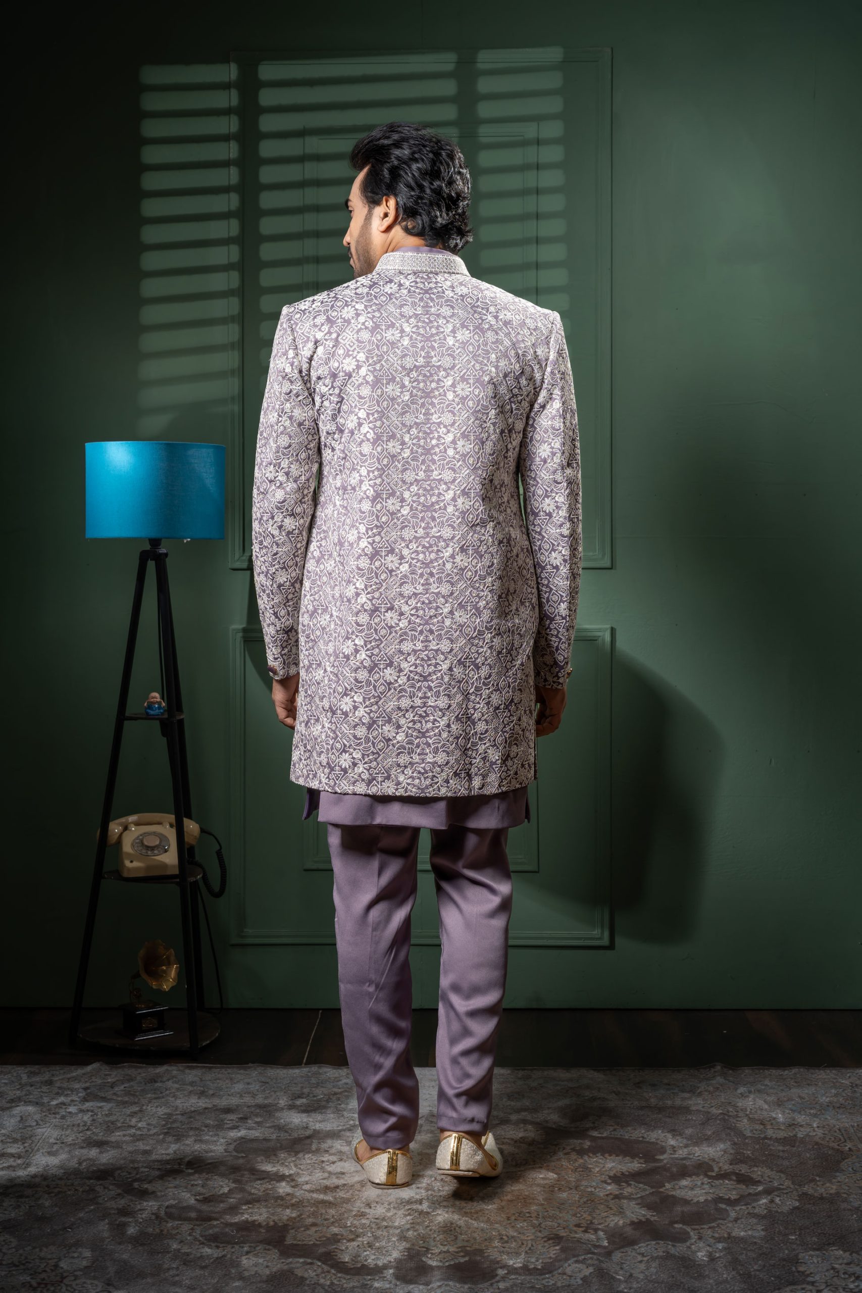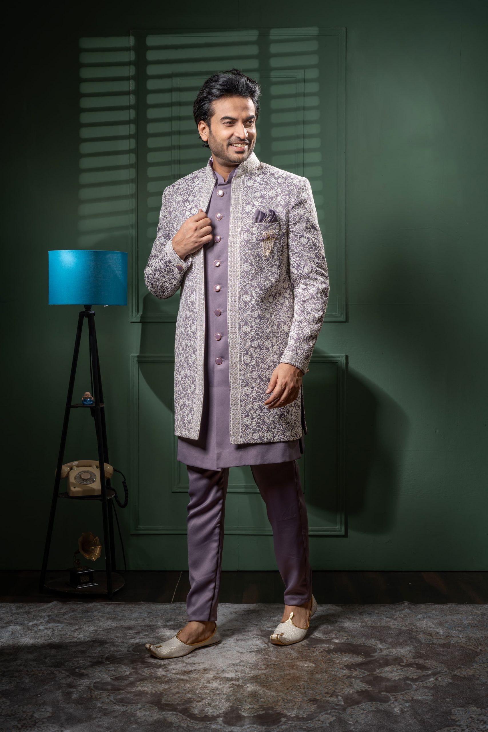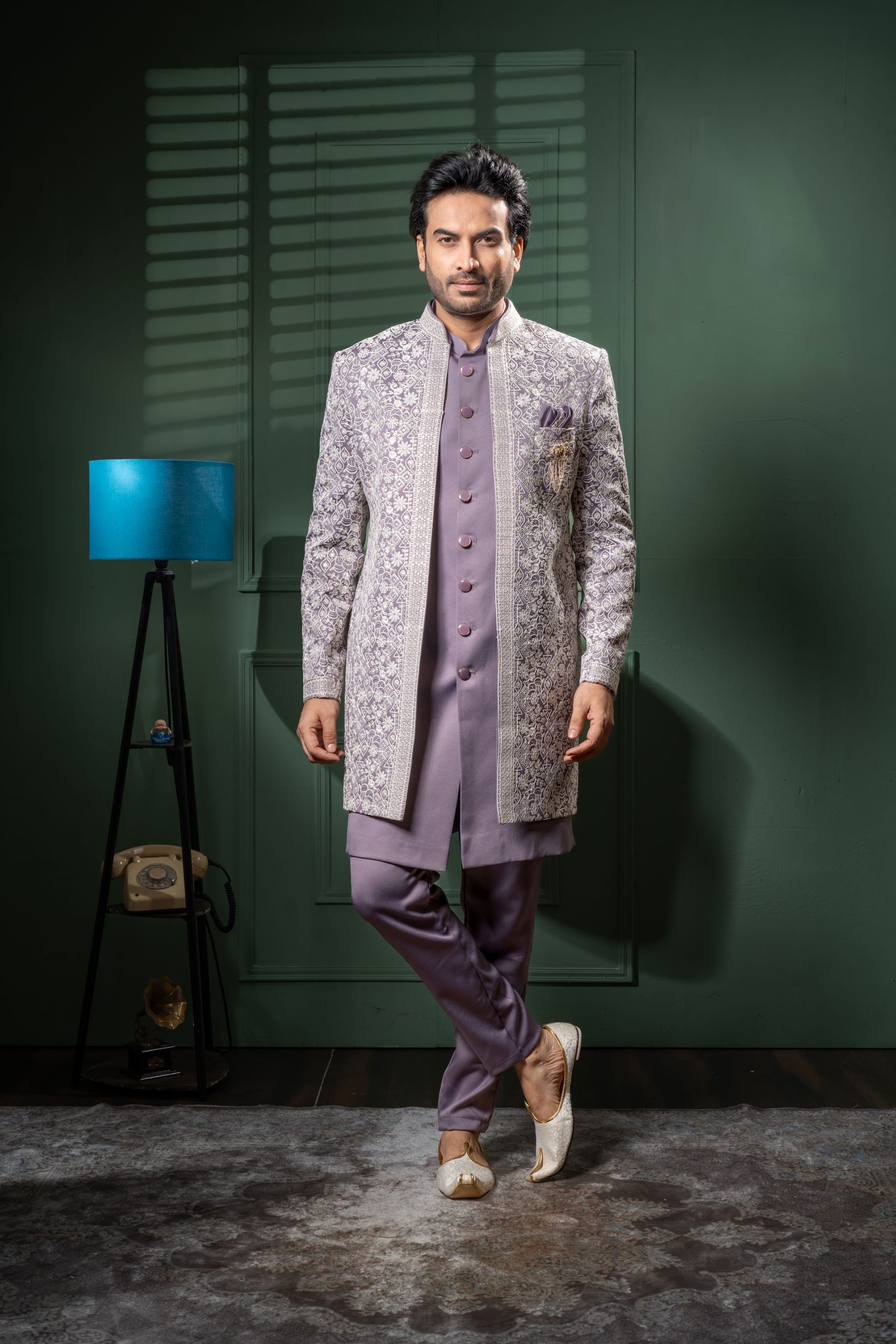 Redefine festive fashion with our special occasion wear, the modern embroidered sherwani. This ensemble breaks from the traditional palette, offering a sophisticated and refreshing look for the modern man. The highlight is the jacket, adorned with intricate and artistic lavender-hued embroidery that creates a rich, textured floral pattern.