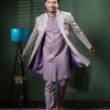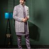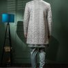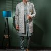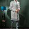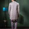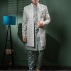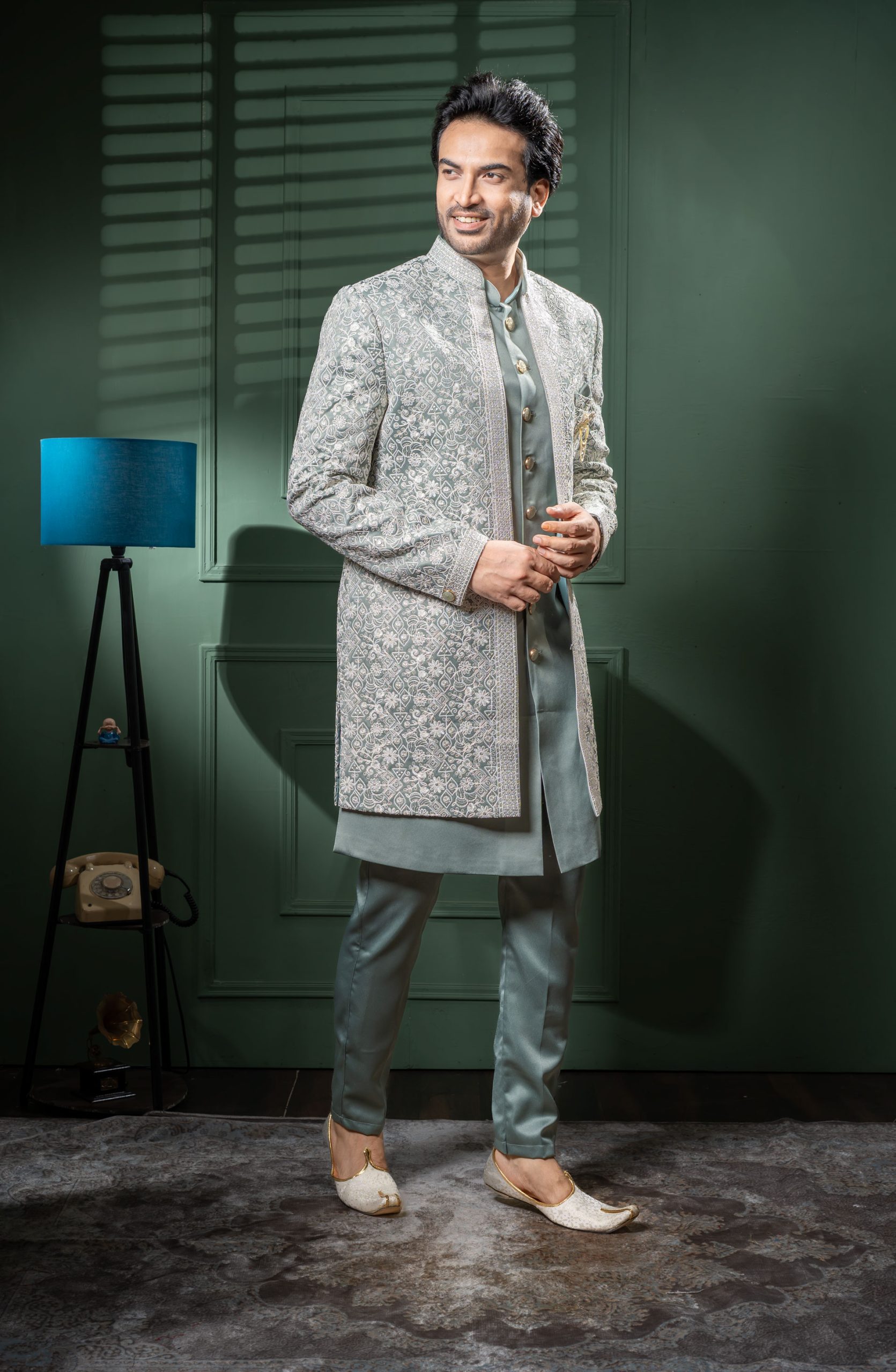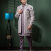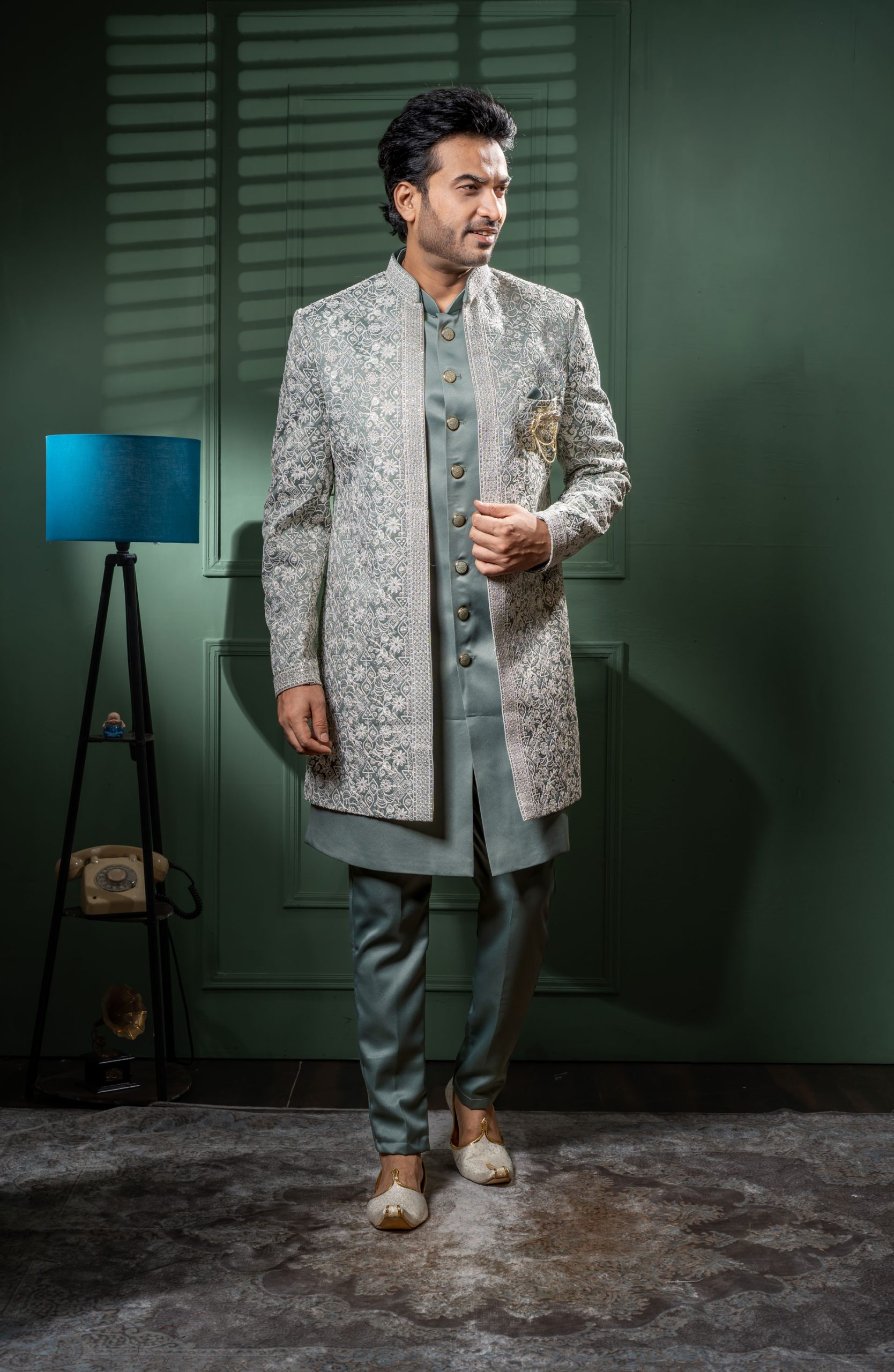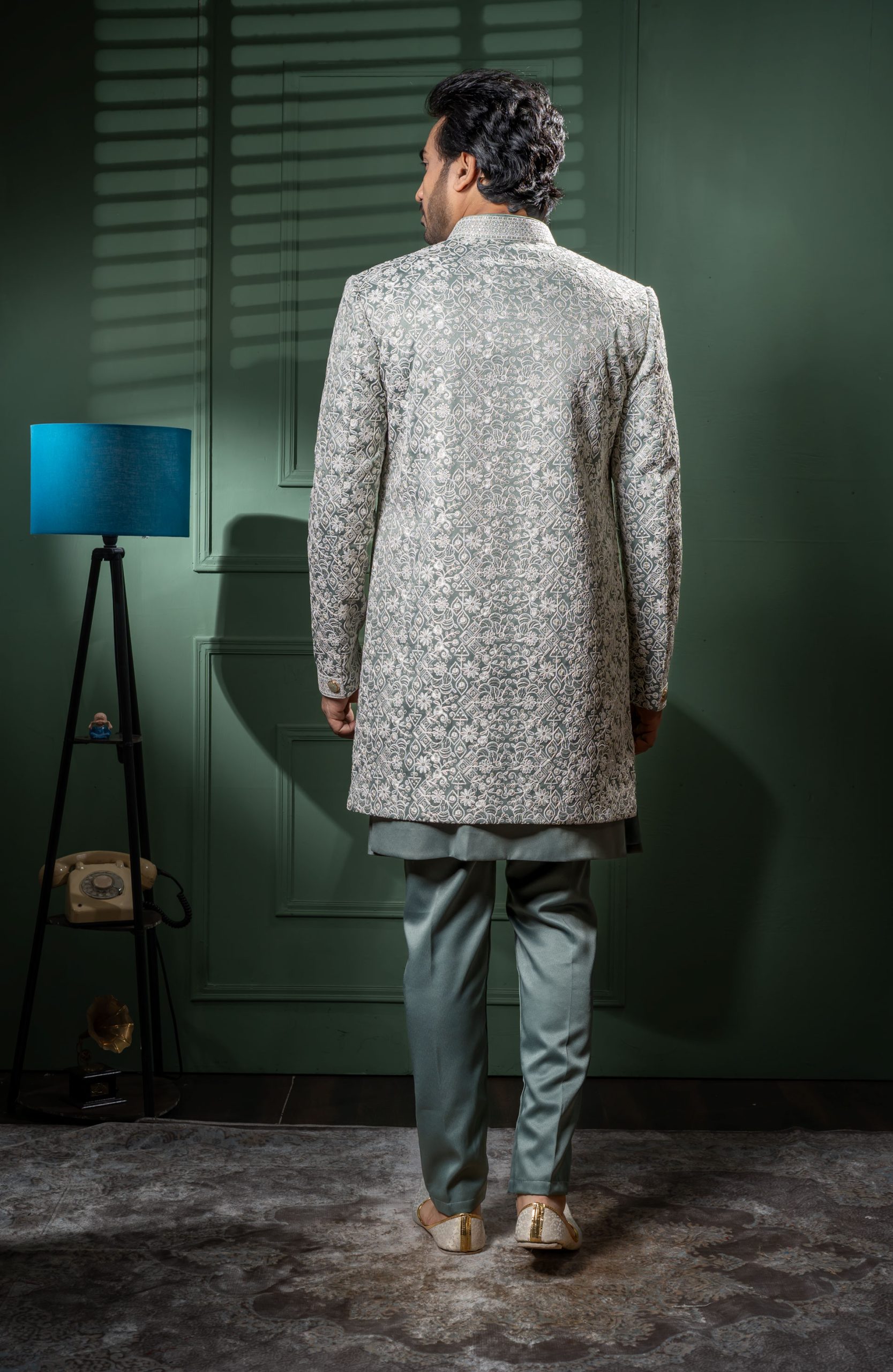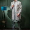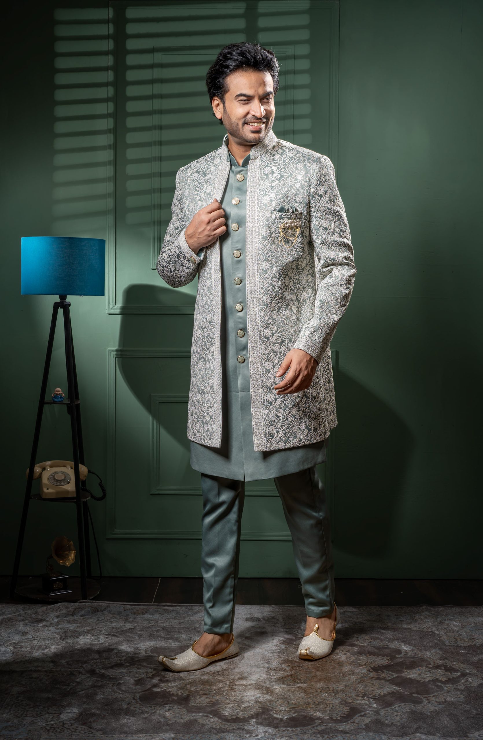 Redefine festive fashion with our special occasion wear, the modern embroidered sherwani. This ensemble breaks from the traditional palette, offering a sophisticated and refreshing look for the modern man. The highlight is the jacket, adorned with intricate and artistic lavender-hued embroidery that creates a rich, textured floral pattern.