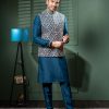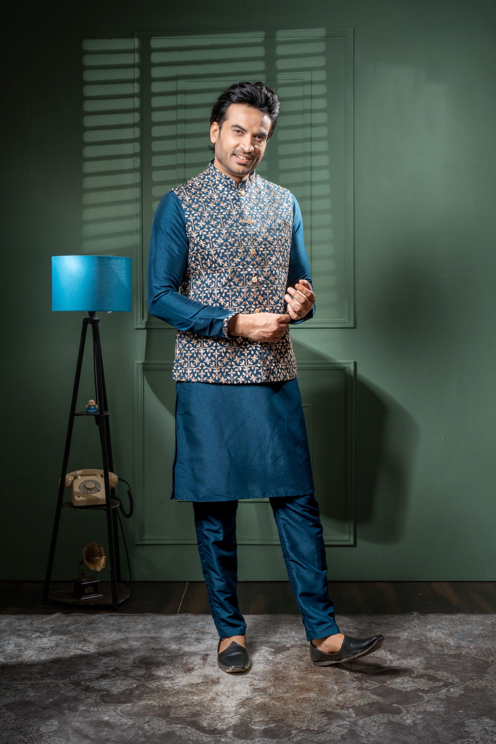 Infuse your festive wardrobe with a vibrant splash of turquoise blue with our premium jacket kurta pajama set. This outfit is a harmonious balance of contemporary style with traditional roots. The refreshing turquoise blue gives off a celebratory vibe and makes for a great choice for a pre-wedding function or a reception ceremony.